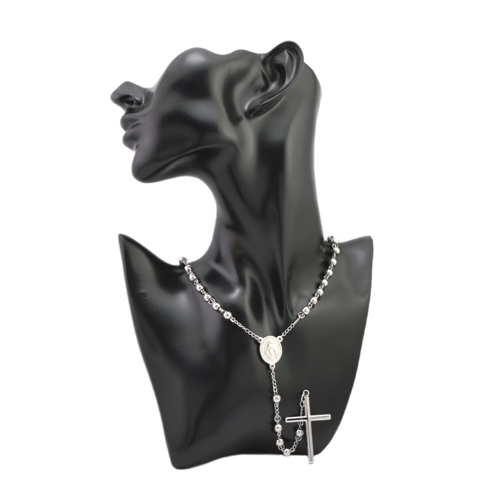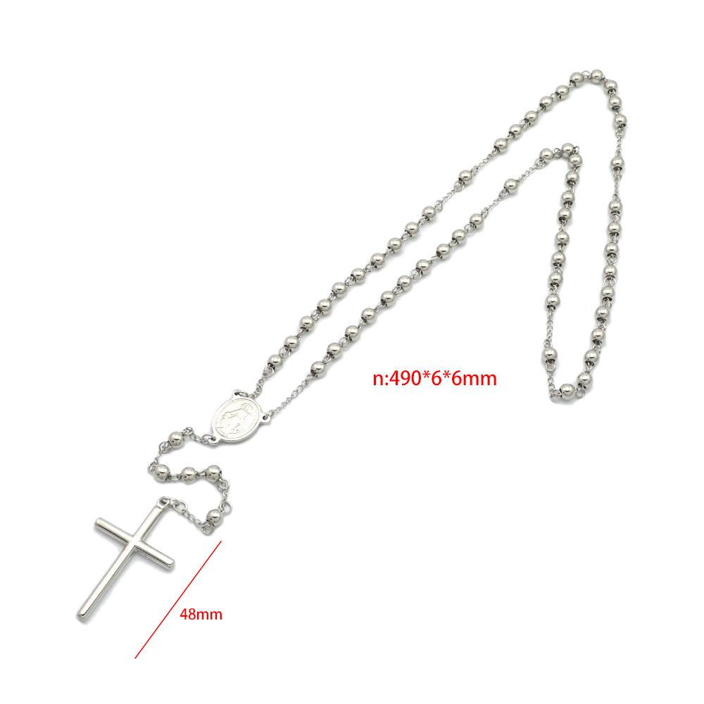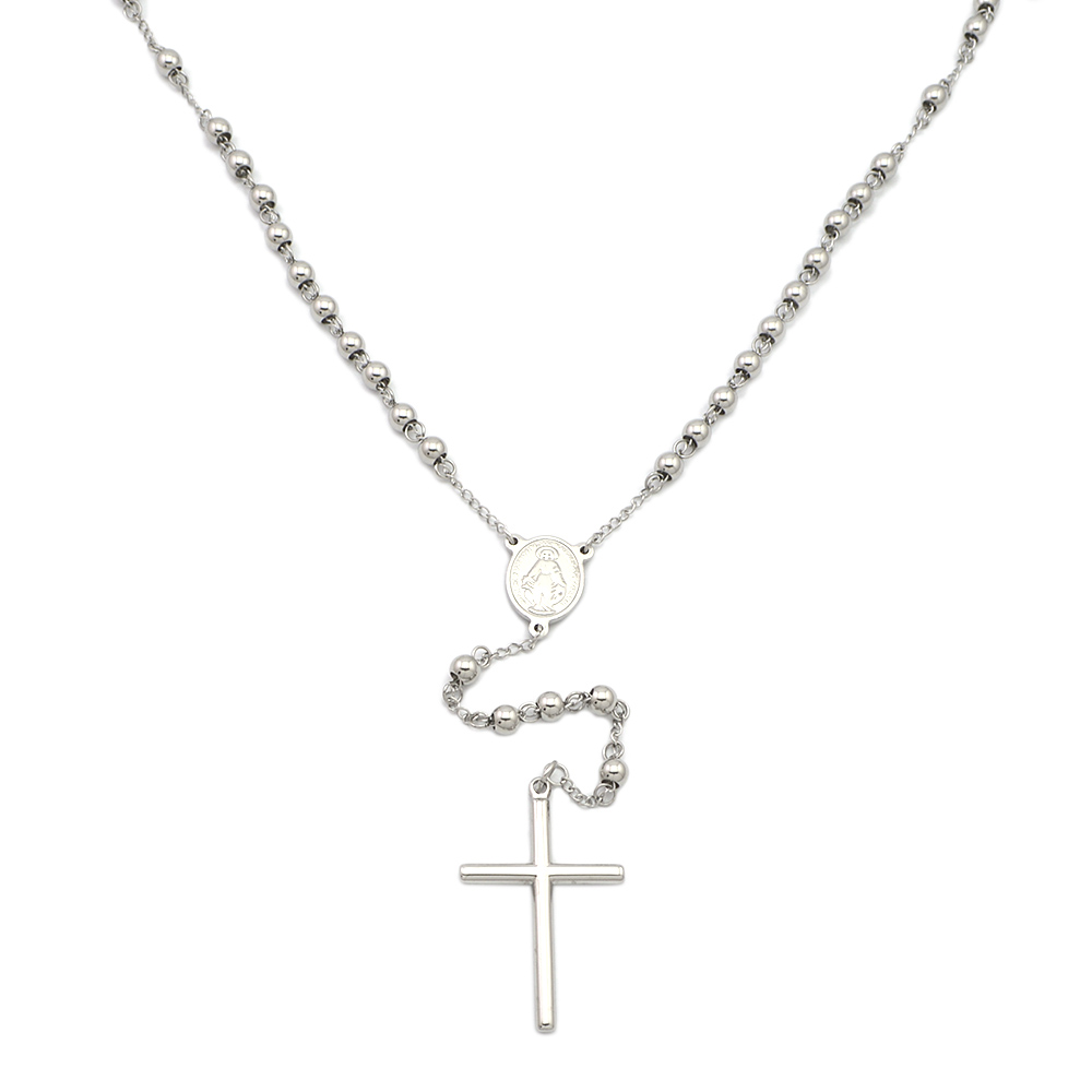 Silver Catholic Rosary Beads Cross Necklace Stainless Steel