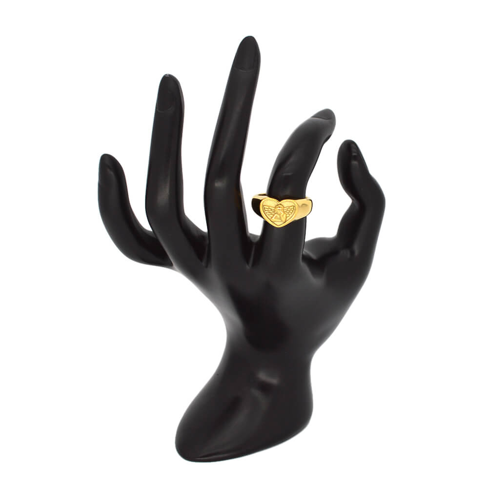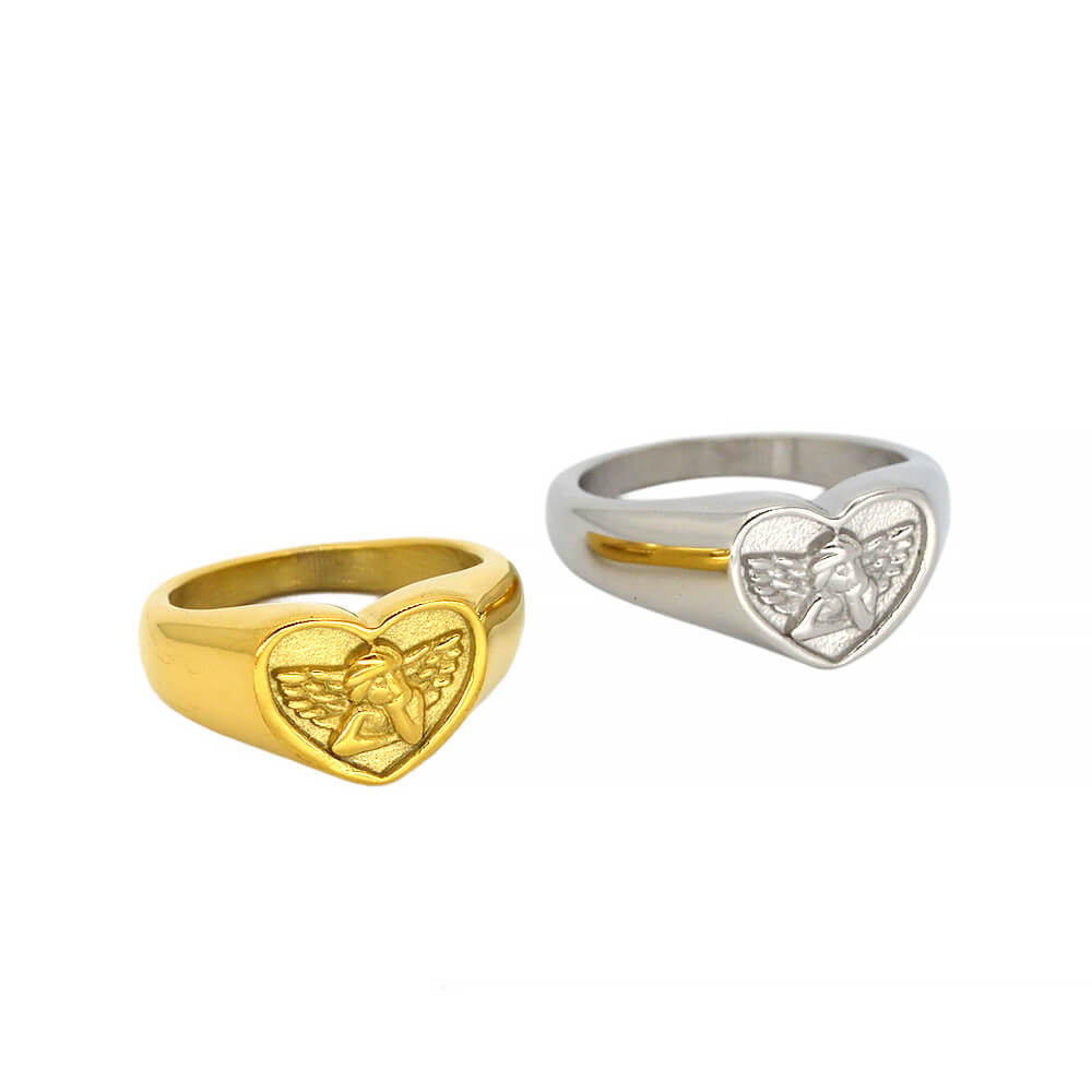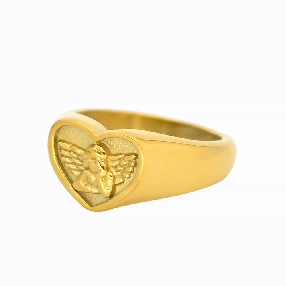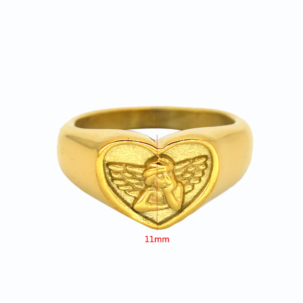 Custom Stainless Steel Women Angel Signet Ring, made in 316 stainless steel with 24 K gold plating; it has US size from 8 to 13.